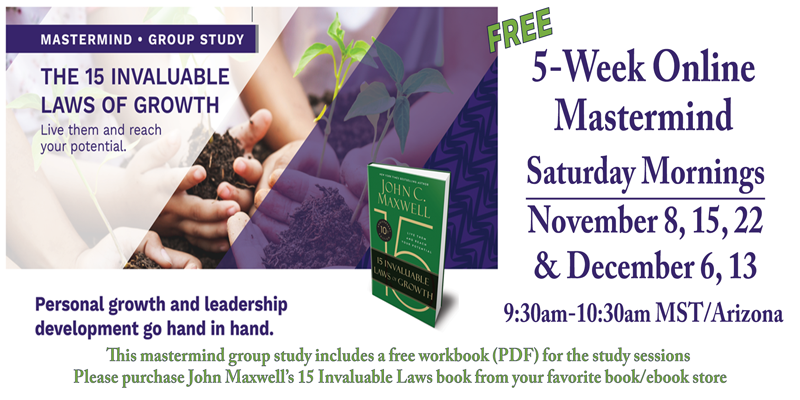 Join on Saturdays beginning November 8th for this FREE 5-week virtual mastermind covering John Maxwell’s 15 Invaluable Laws of Growth.
